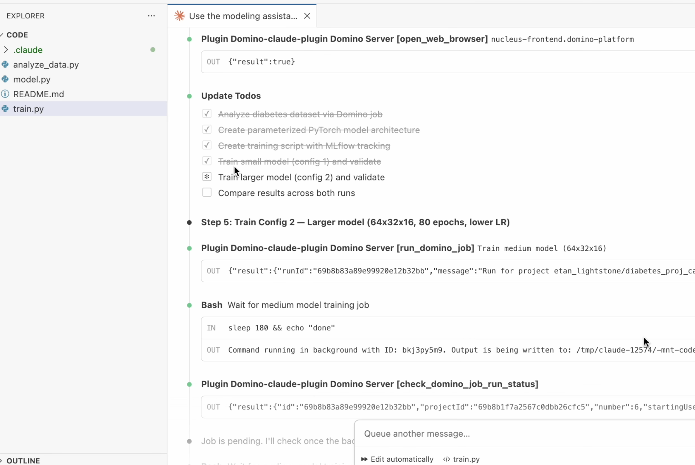 The agent writes a data analysis script, generates a parameterized PyTorch model, creates a training script with MLflow tracking, and submits training as Domino Jobs. All steps run automatically.