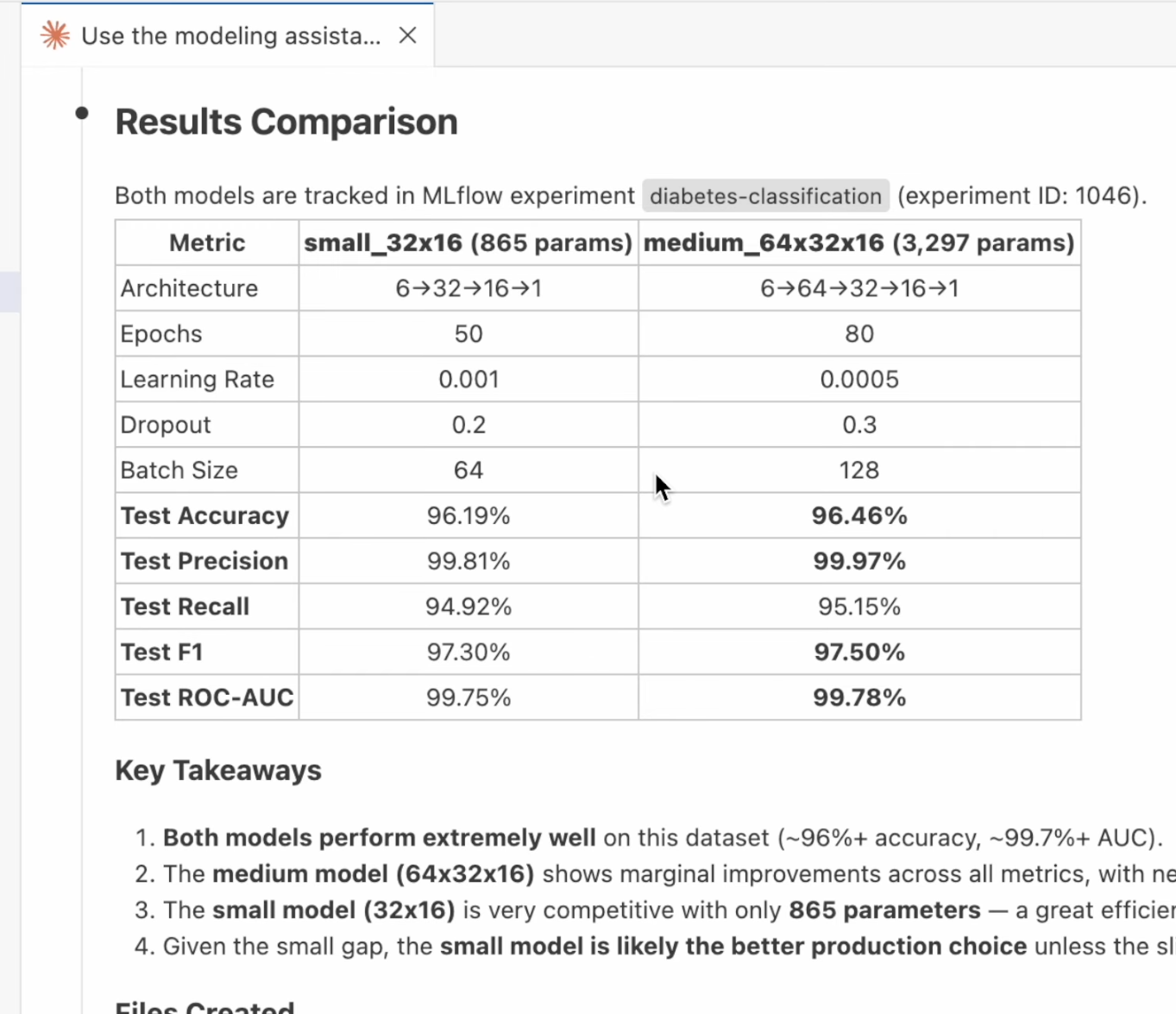 After all models finish training, the agent generates a comparison grid showing both models side by side with key takeaways: