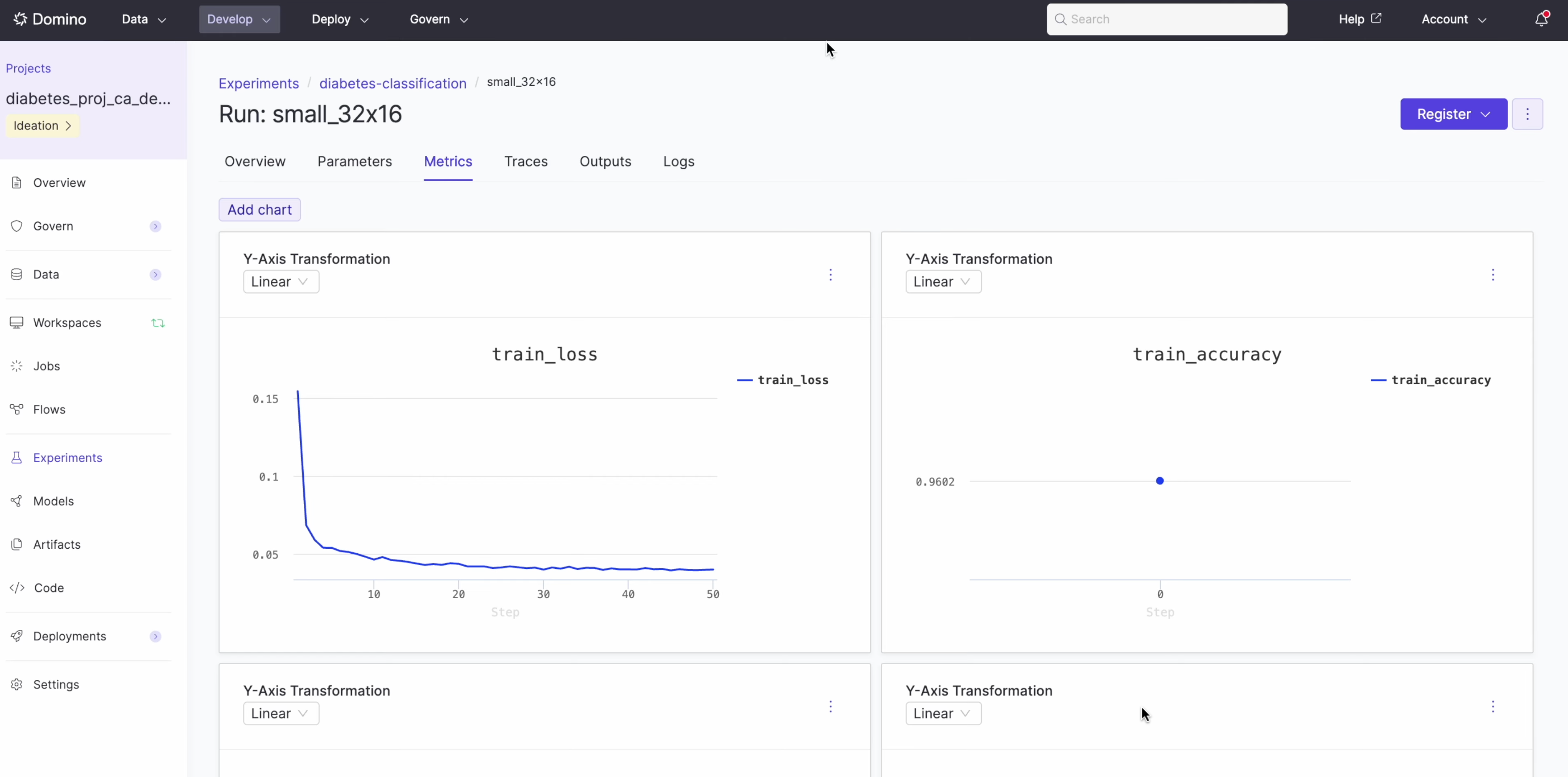 All lineage stays intact. The Domino platform tracks, reproduces, and audits every step from data analysis to model comparison.