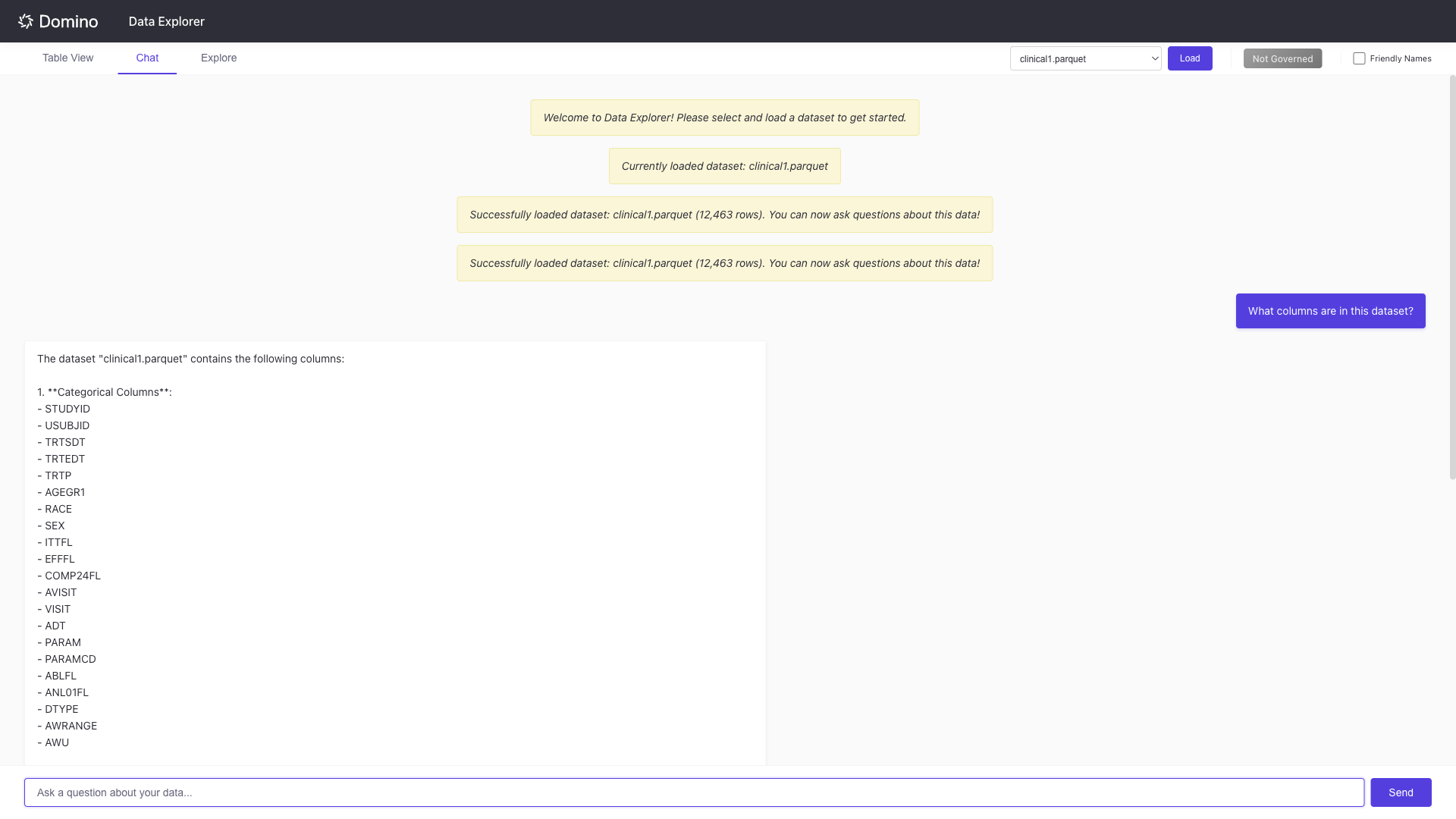 When you load a dataset that’s part of a Domino Governance bundle, a green Governed badge appears in the header. This indicates the file is being tracked for compliance and audit purposes.