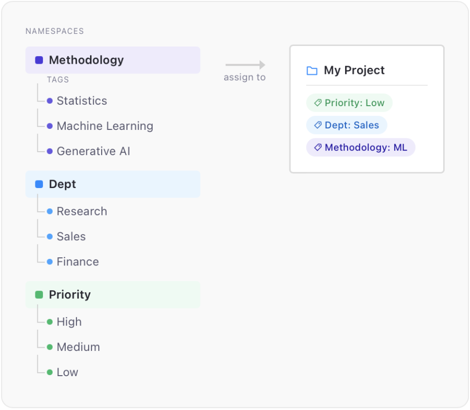 Think of Namespaces as the category or dimension you use to classify something, and Tags as the allowed values each category can take on.