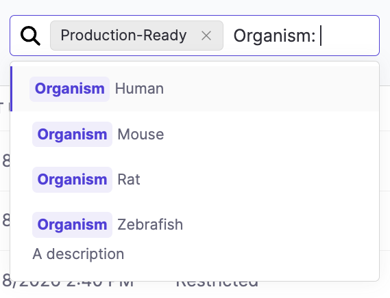 Each entity type surfaces tag filtering in context. When you type a namespace name followed by a colon, the search field narrows suggestions to tags within that namespace only — making it fast to filter by a specific classification axis.