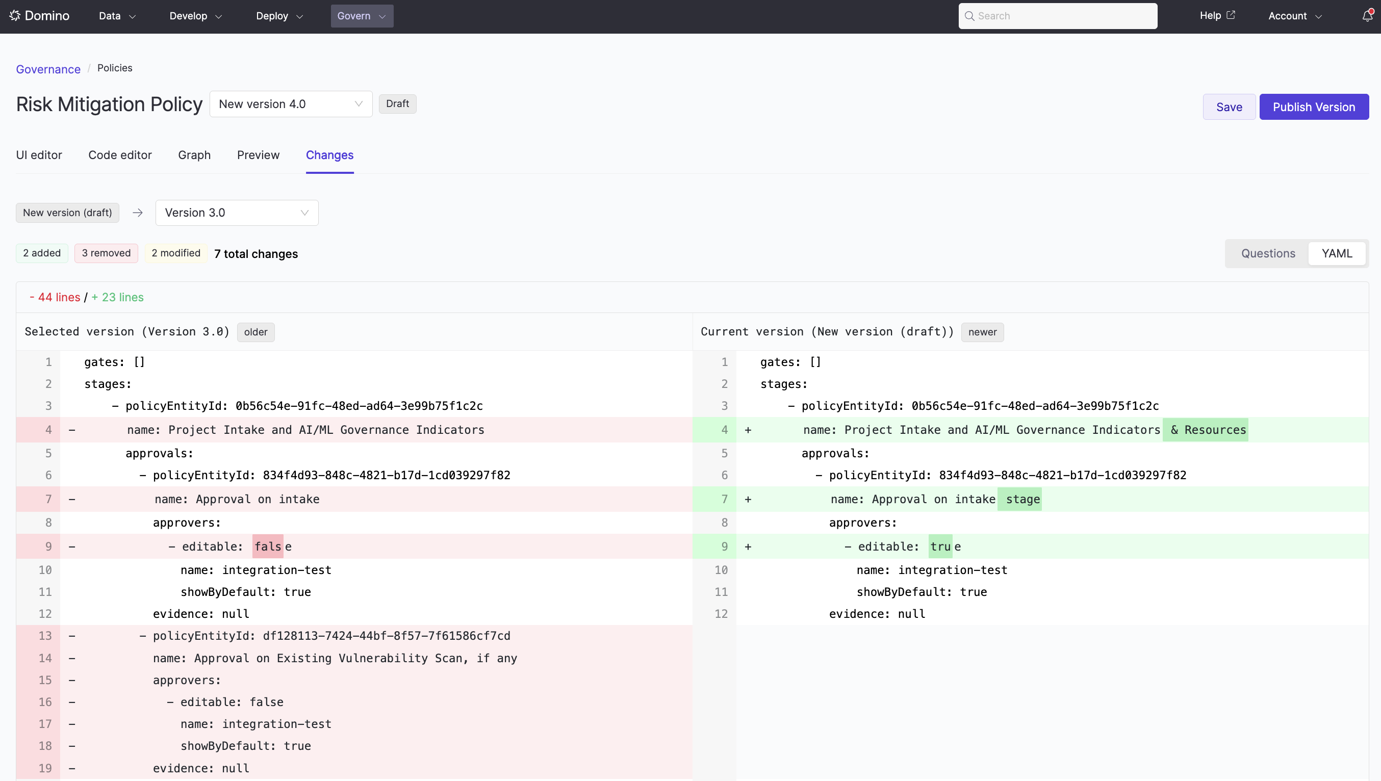 When drafting a new policy version or reviewing a published one, you can use the Changes tab to compare it against the previous version. The diff view shows both a side-by-side YAML comparison and a visual representation of structural changes, making it easy to spot what was added, removed, or modified.