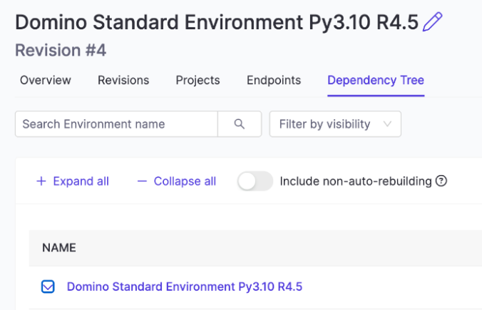 Dependency Tree | The Dependency Tree view is similar to the global tree view, except that it only displays the subtree of the selected environment, with it as its only root node. By default, only the descendants that would receive automatic downstream rebuilds are shown. The Include non-auto-rebuilding toggle allows you to see all descendants. |