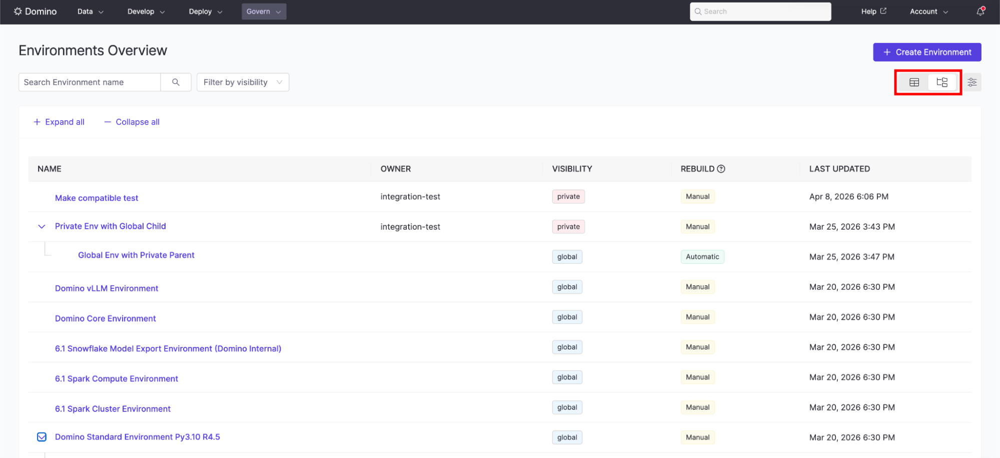 To switch from the default table view to the tree view, use the selector on the top right, below the + Create Environment button. The tree view allows you to see hierarchical relationships between environments, collapse and expand nodes with children, view environment metadata, and filter by visibility.